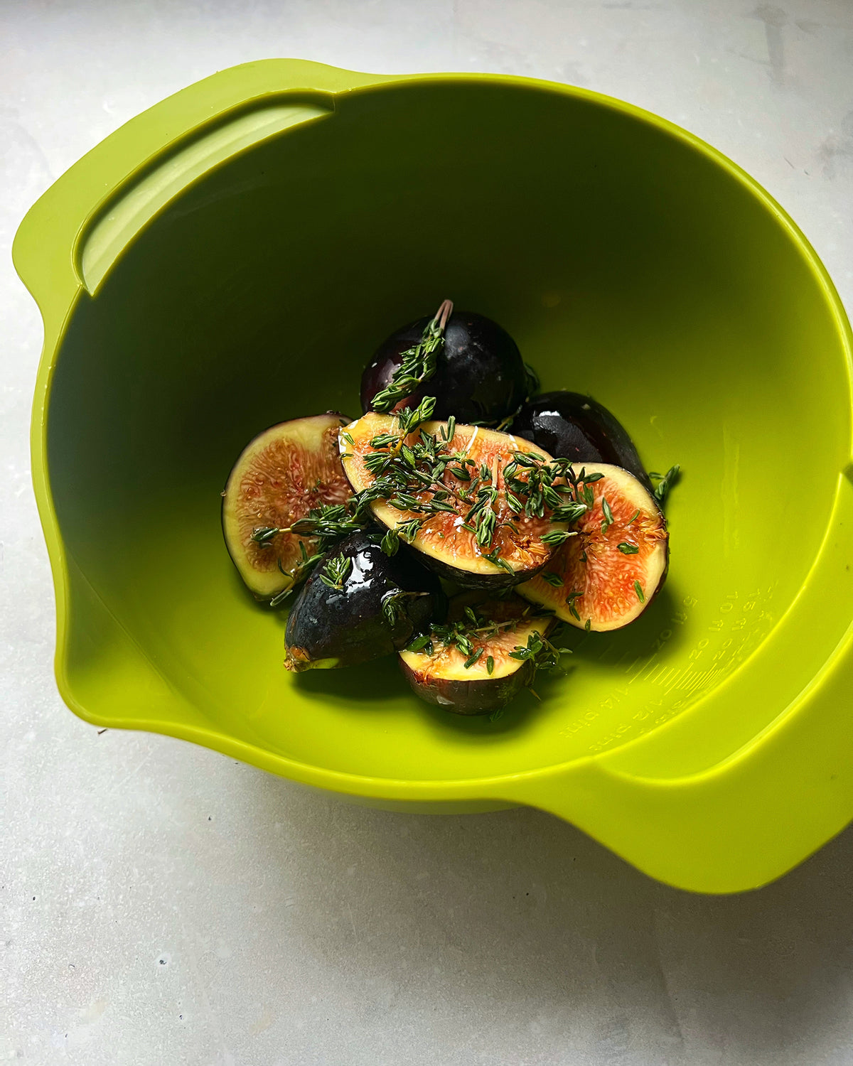 - Step 2Mix the figs with a little olive oil, pepper and half the thyme. Place in the pan cut side down. When they are caramelised turn them over. Cook for another minute or so and remove from the pan.