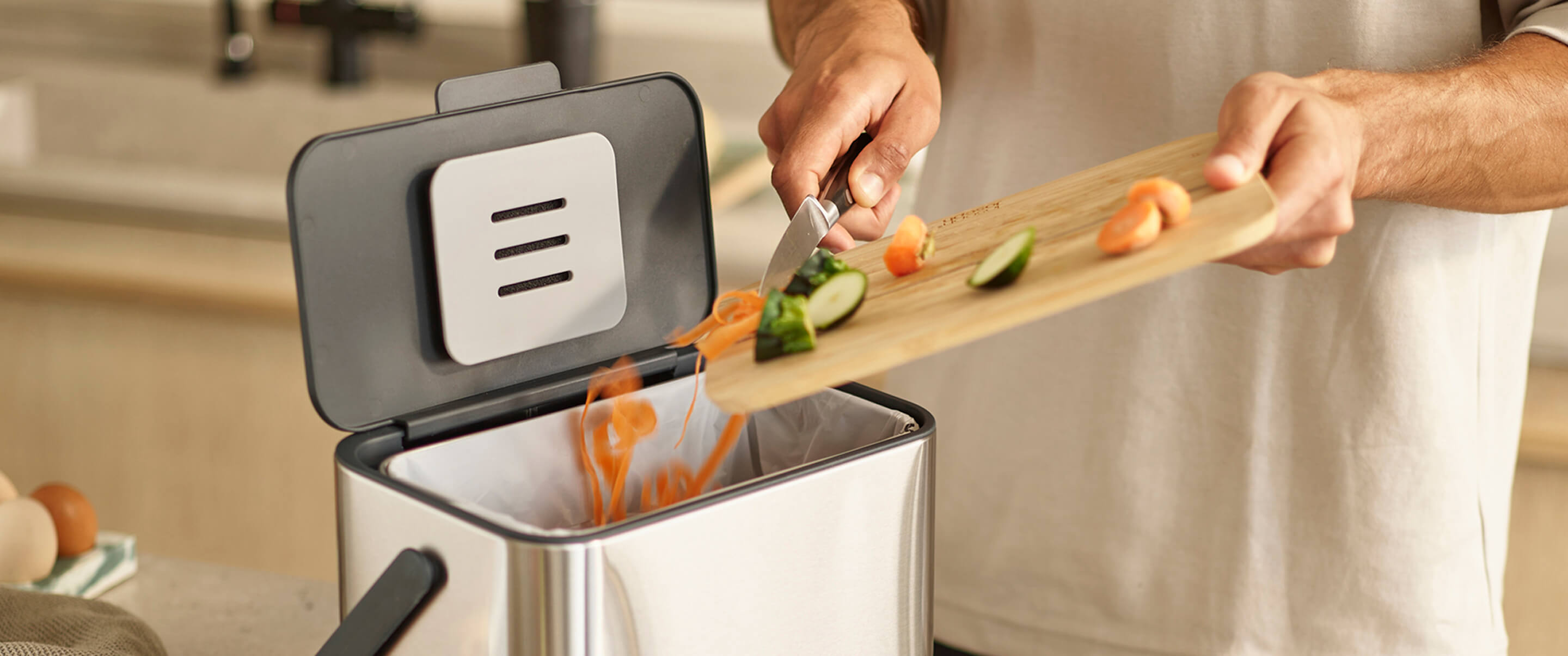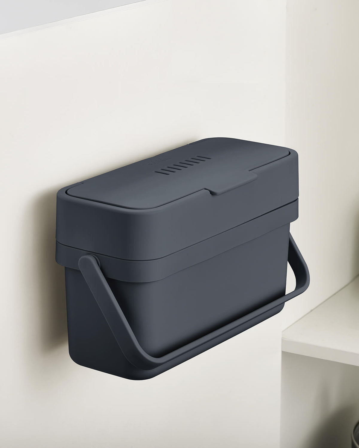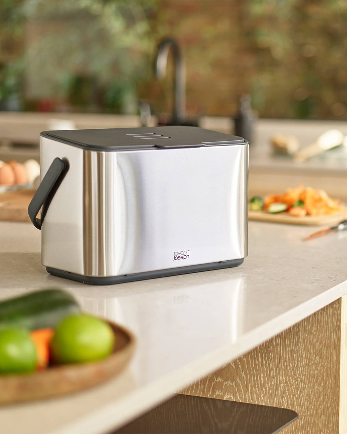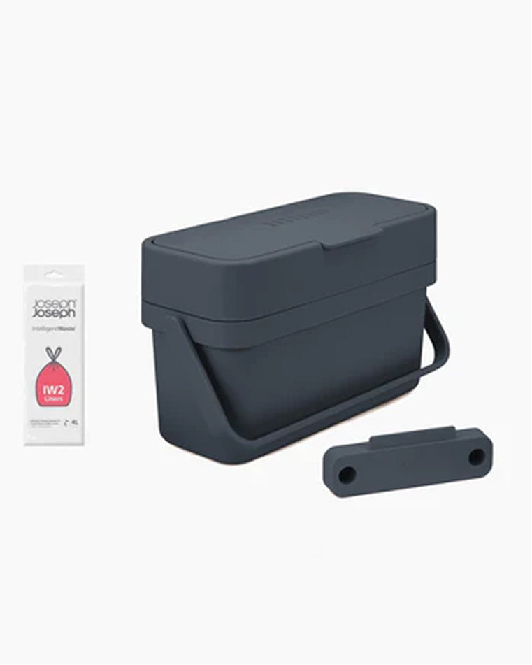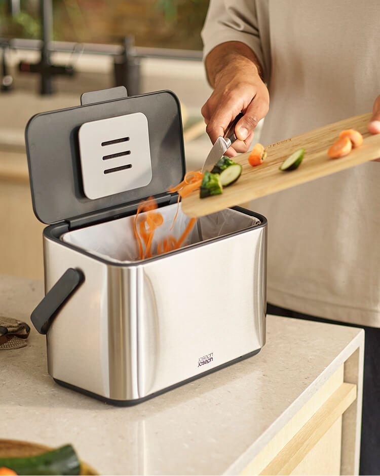 Ideally, you’d keep a small counter-top food waste caddy inside for everyday use, and keep your larger council-provided food waste bin outside (these are usually 23L so big enough to handle a week or two of food waste). Indoors food waste caddies are best positioned in the spot that you’ll use them most: that might be on your counter top or in a cupboard door in the area where you do most of your food prep. Our Joseph Joseph food waste caddies all have handles making them easy to move around the kitchen as you work.